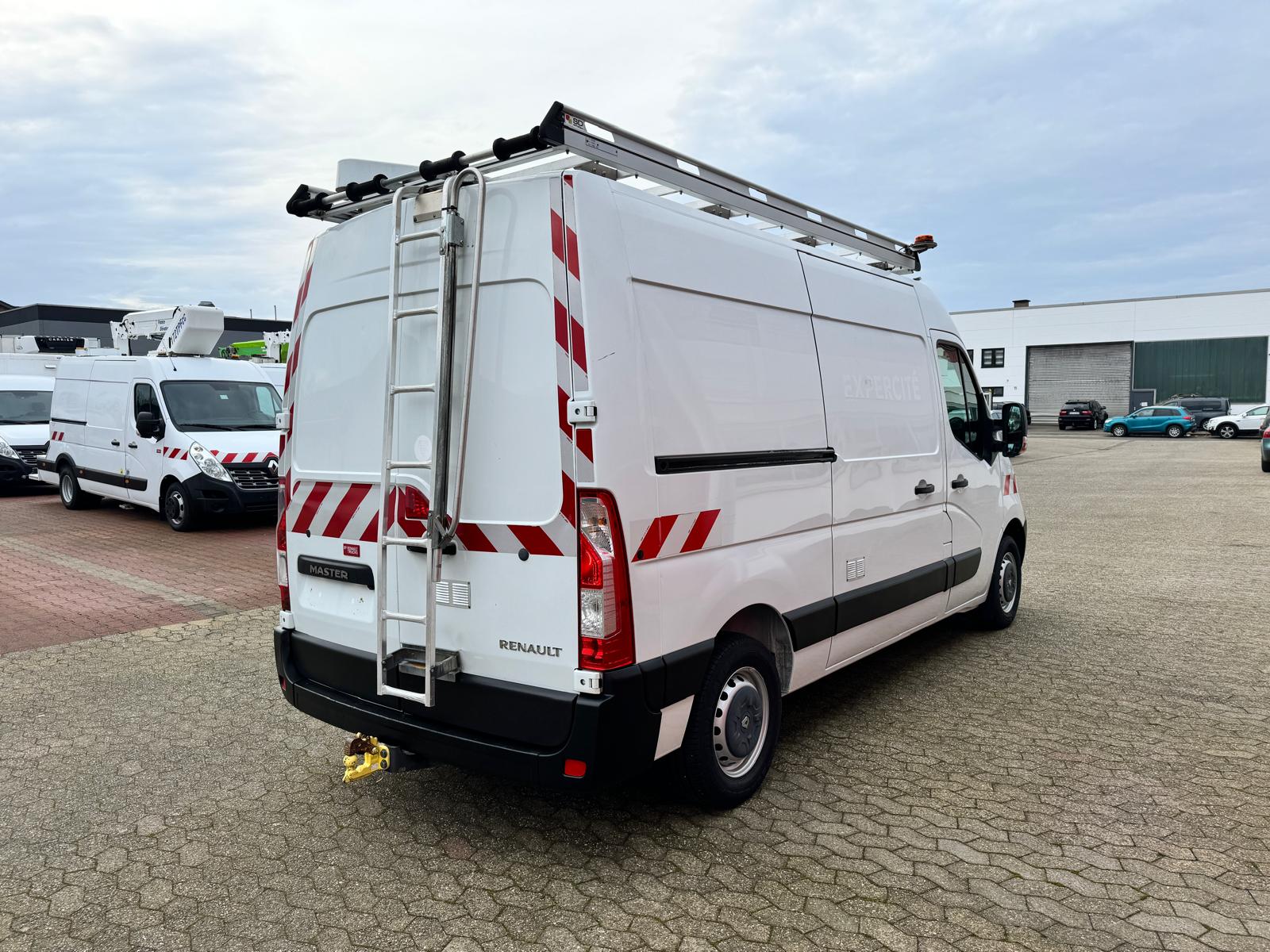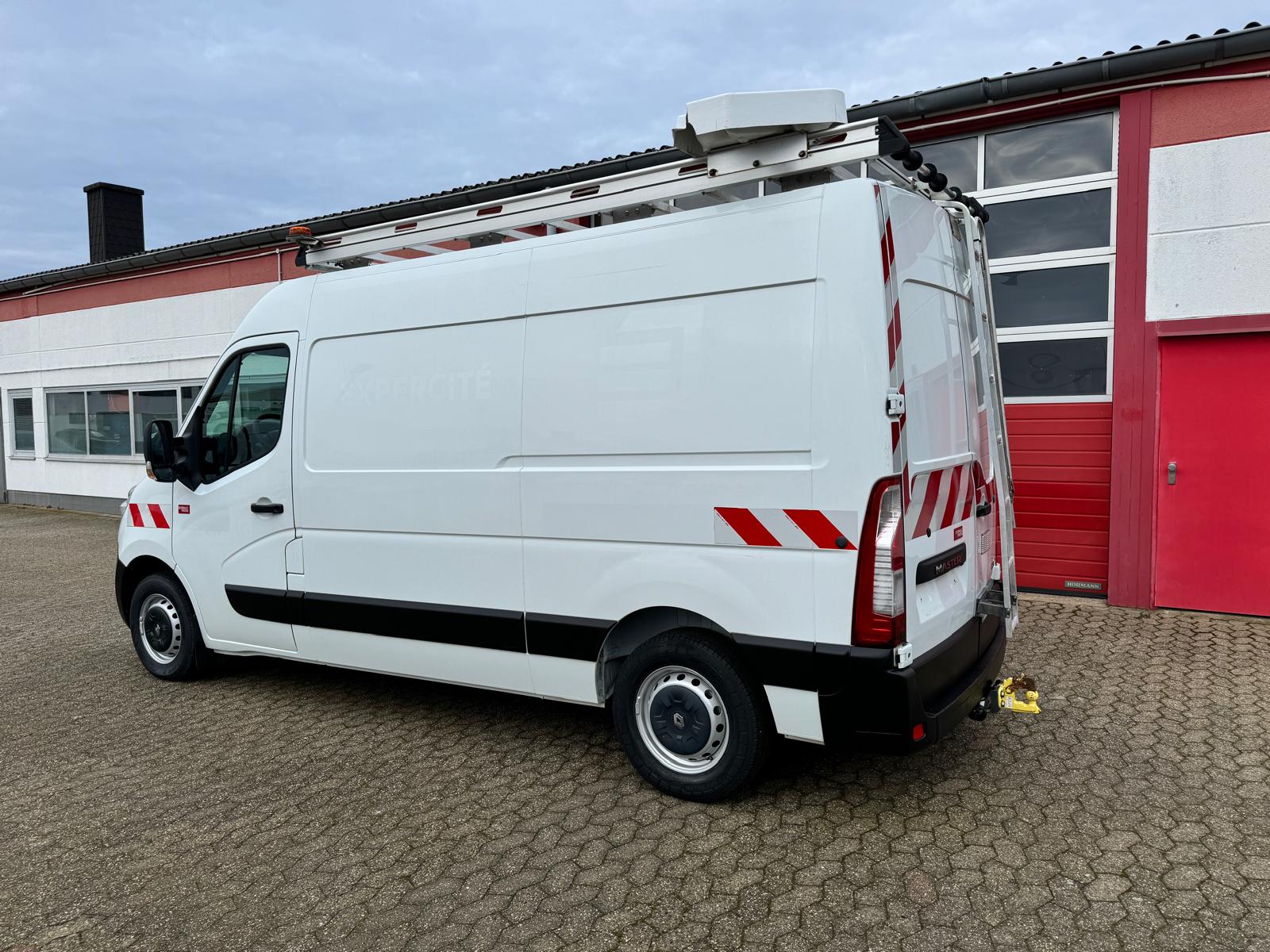 Renault Master to solidny i wszechstronny pojazd użytkowy, idealnie nadający się na mobilny warsztat. W tej konfiguracji został wyposażony w drabinę zamontowaną na tylnych drzwiach, co ułatwia dostęp do dachu pojazdu oraz załadunek i transport materiałów na bagażniku dachowym z relingami.