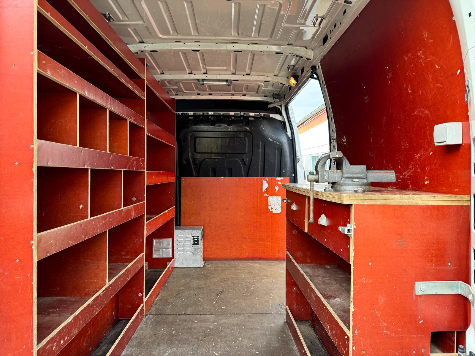 Wnętrze zostało profesjonalnie przystosowane do pracy – zamontowano trwałe drewniane półki, które zapewniają długowieczność i estetyczny wygląd. Dzięki temu narzędzia i materiały są zawsze dobrze uporządkowane i łatwo dostępne. Przestrzeń ładunkowa została ergonomicznie zaprojektowana, aby zapewnić komfortowe użytkowanie jako mobilny warsztat.