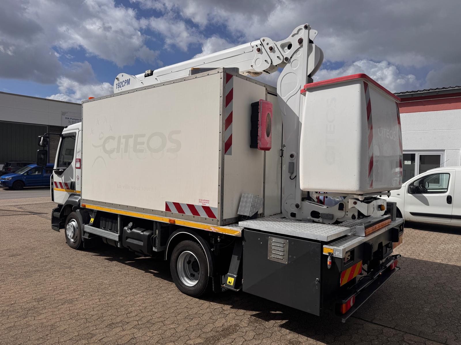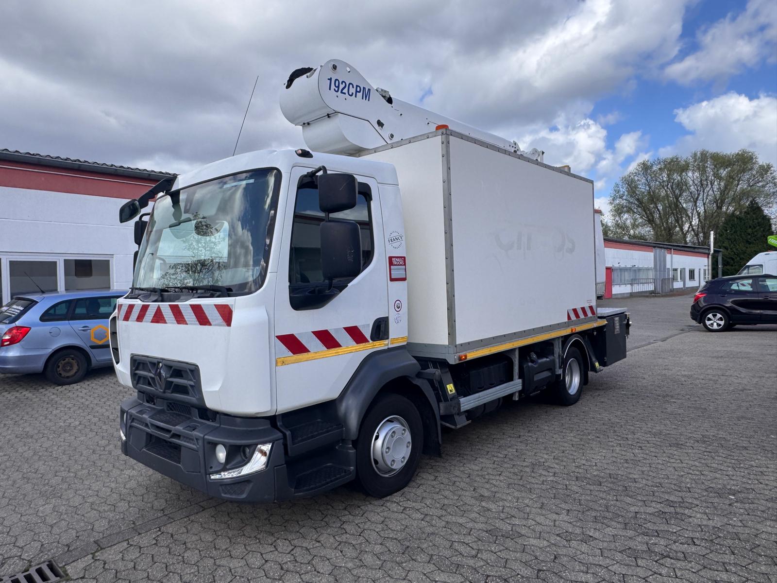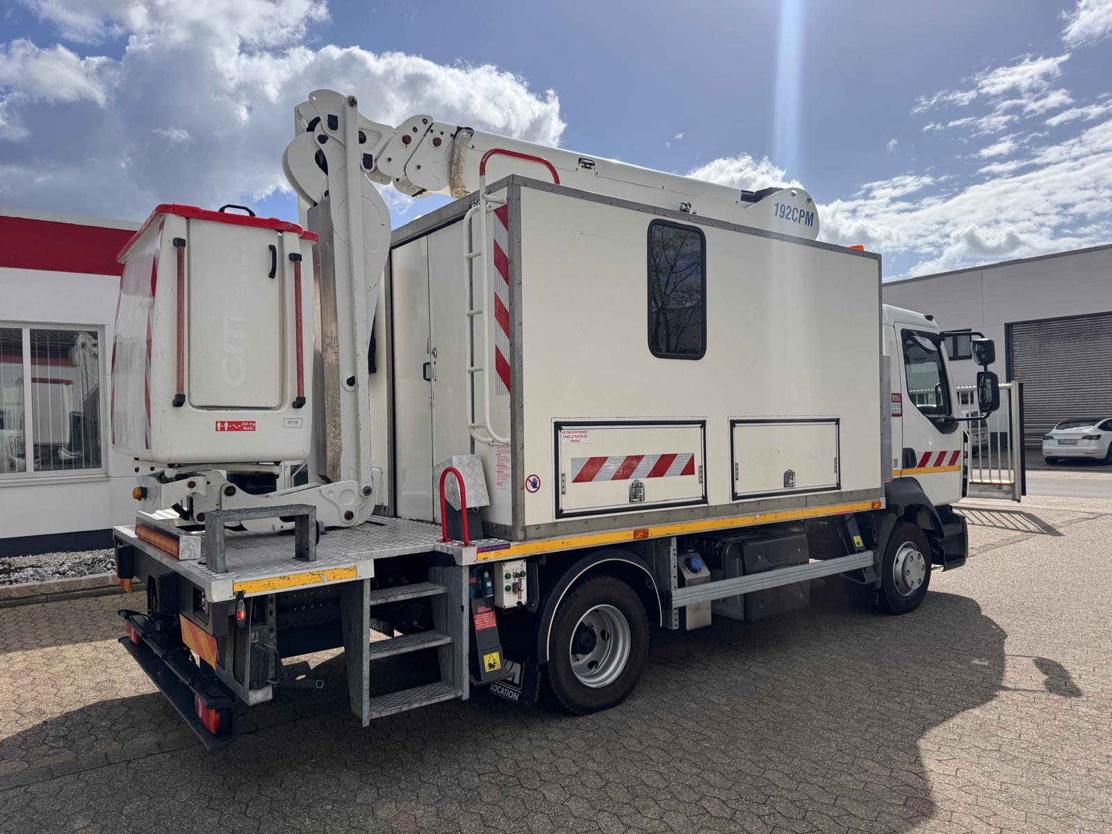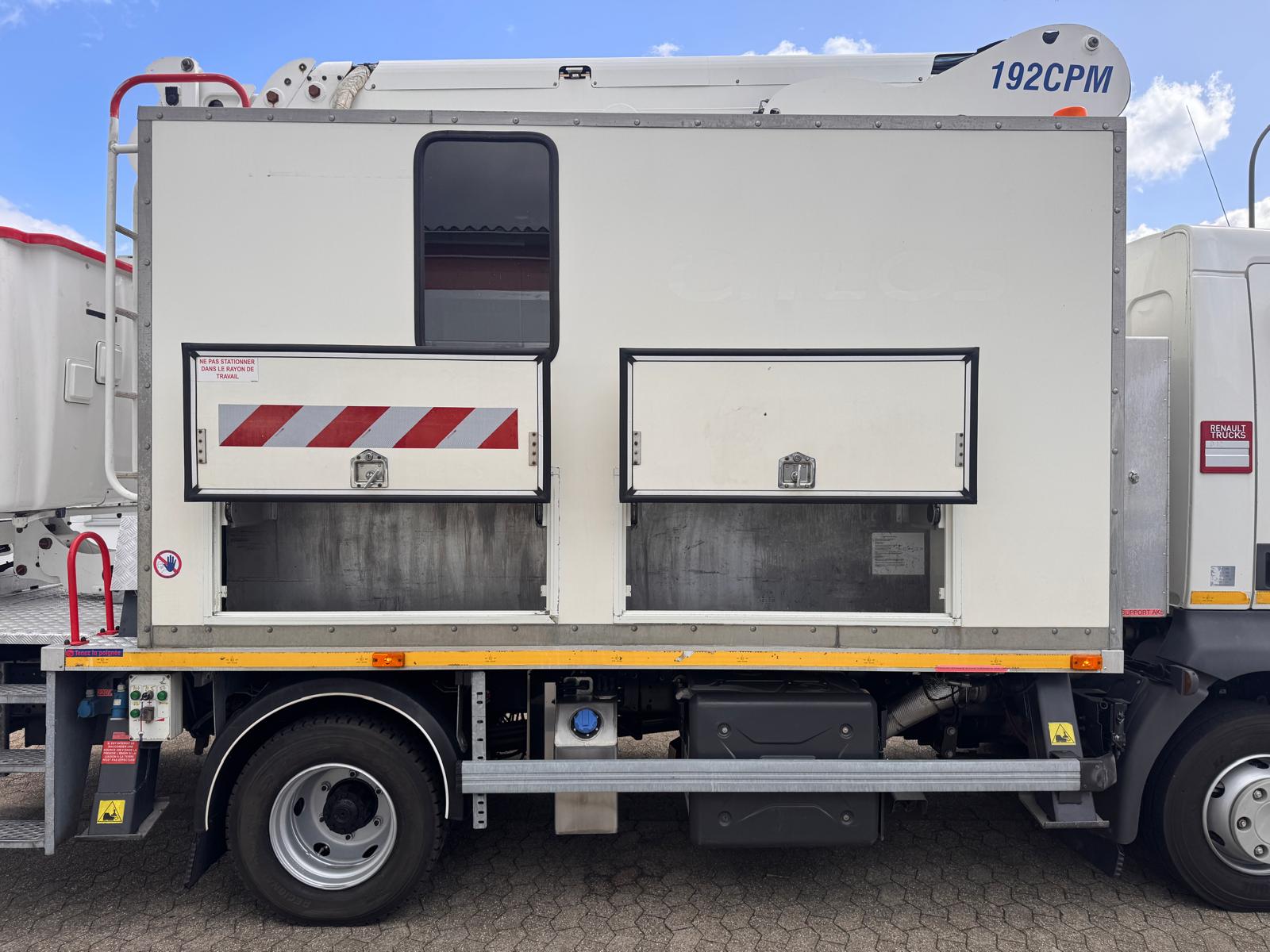 Renault D12 z podnośnikiem koszowym France Elevateur 192 CPM, zamontowany na 12-tonowej ciężarówce, przeznaczony m.in. do prac przy czyszczeniu elewacji. Kosz wyposażony jest w pompę wysokociśnieniową (200 bar) napędzaną silnikiem benzynowym oraz dodatkowe przyłącze wody z pompą elektryczną 24 V (2,7 bar). W koszu znajduje się także przyłącze sprężonego powietrza.