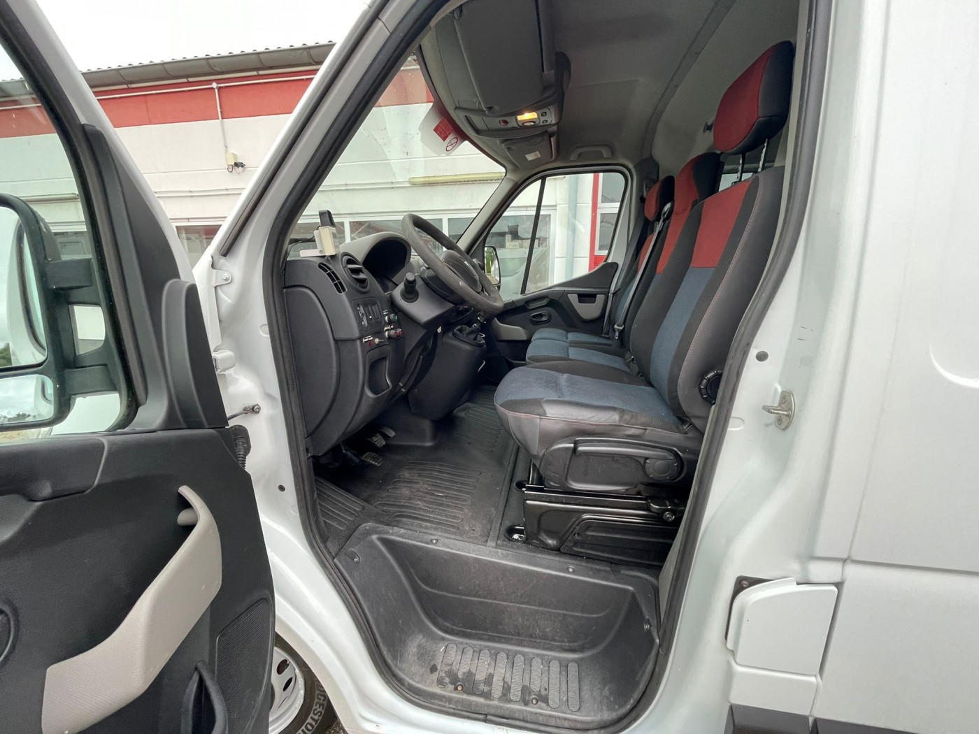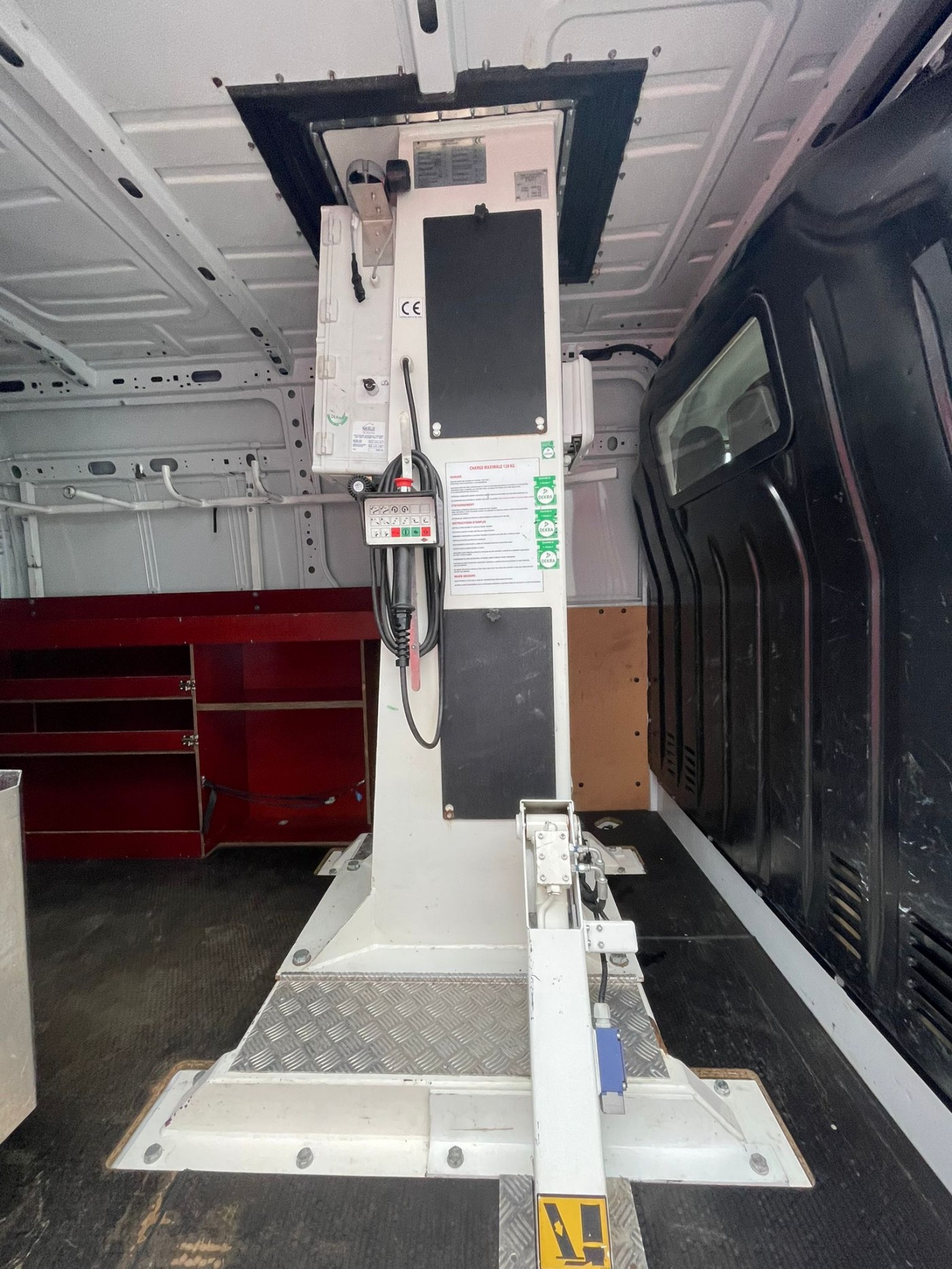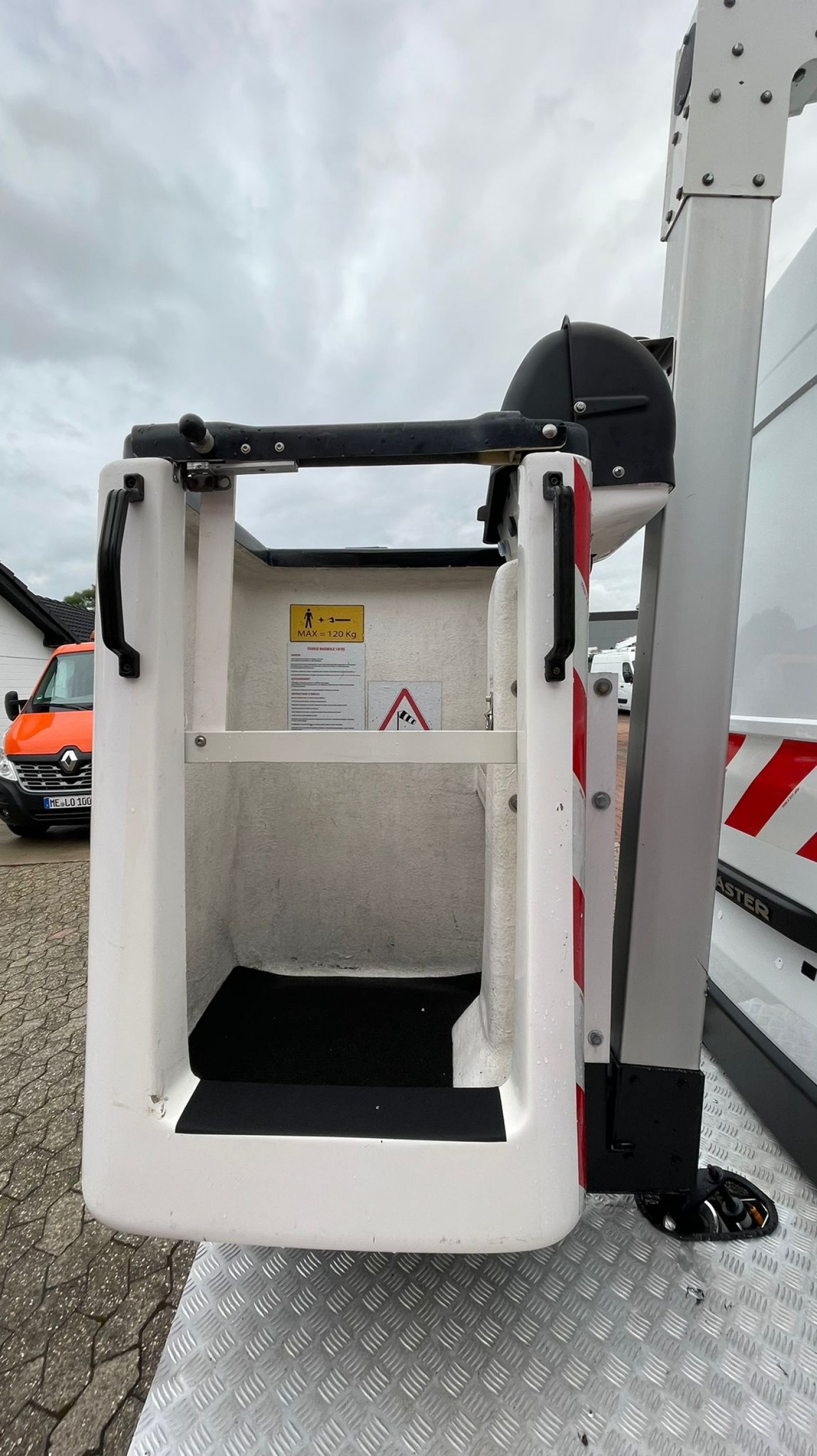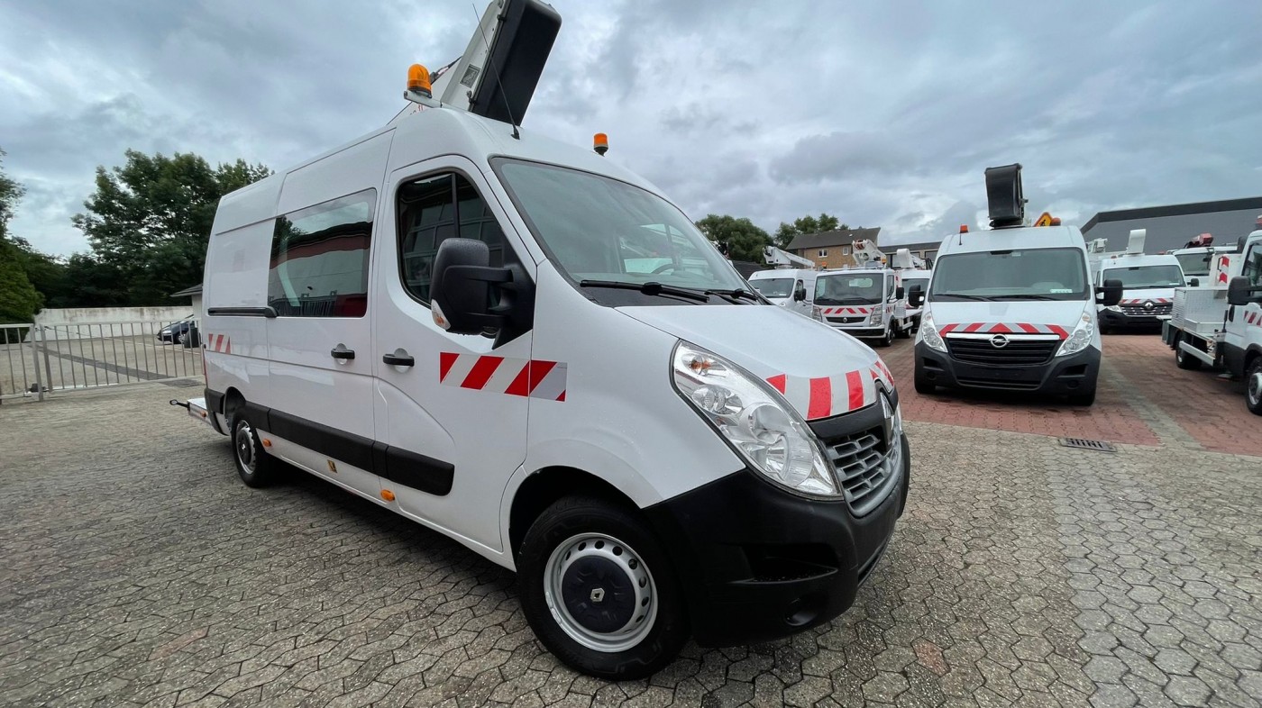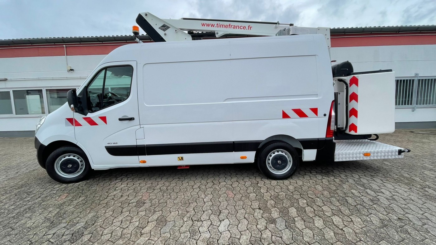 Podnośnik koszowy ET 26 francuskiego producenta Time France zamontowany na Renault Master - pompa hydrauliczna ze sprzęgłem magnetycznym jest napędzana pasem klinowym napędzanym przez silnik pojazdu.