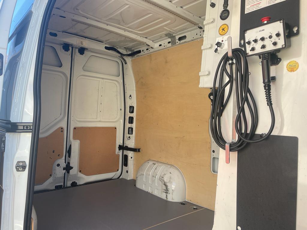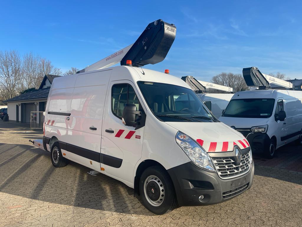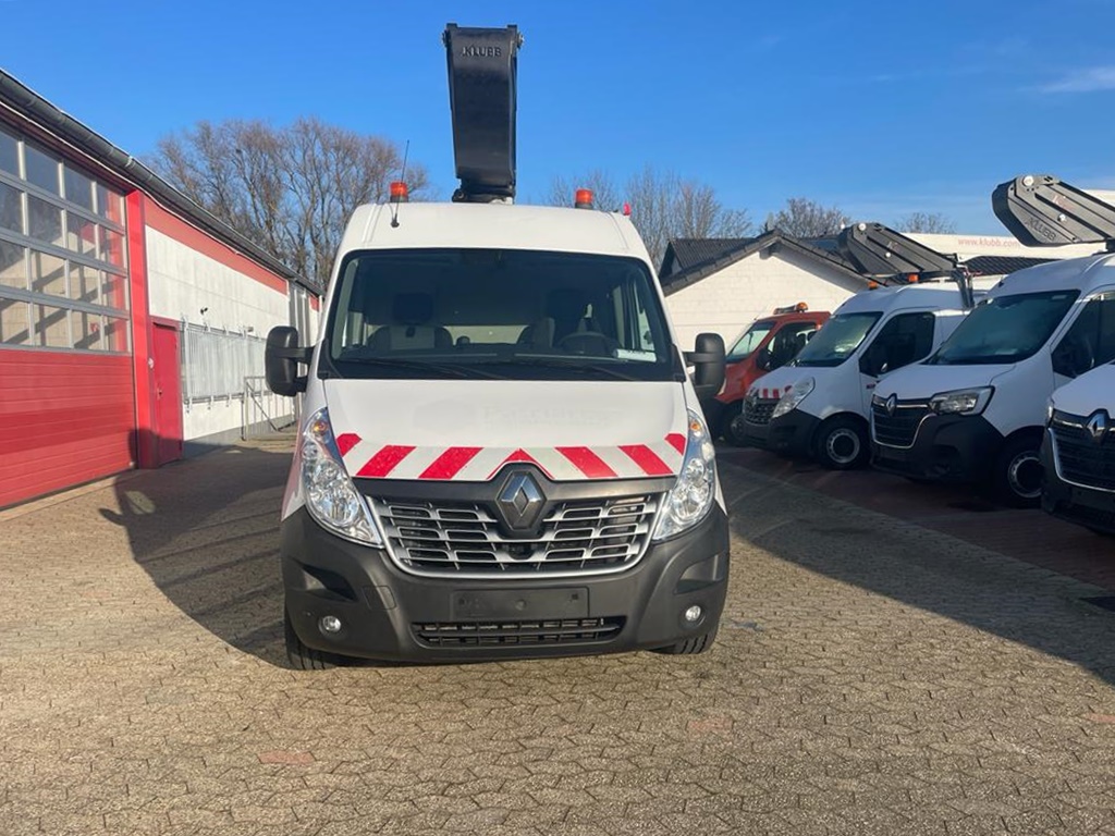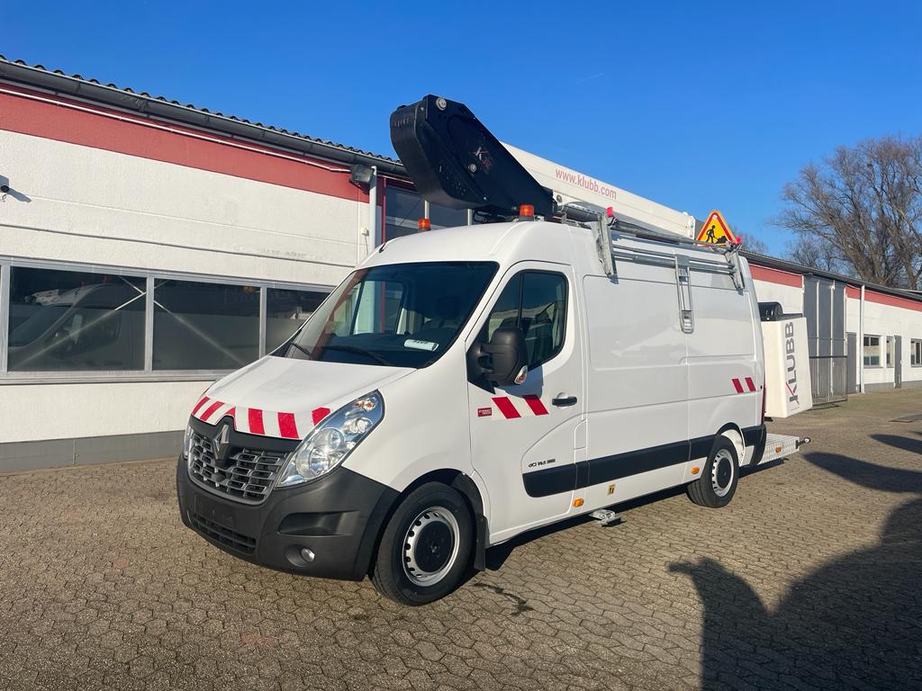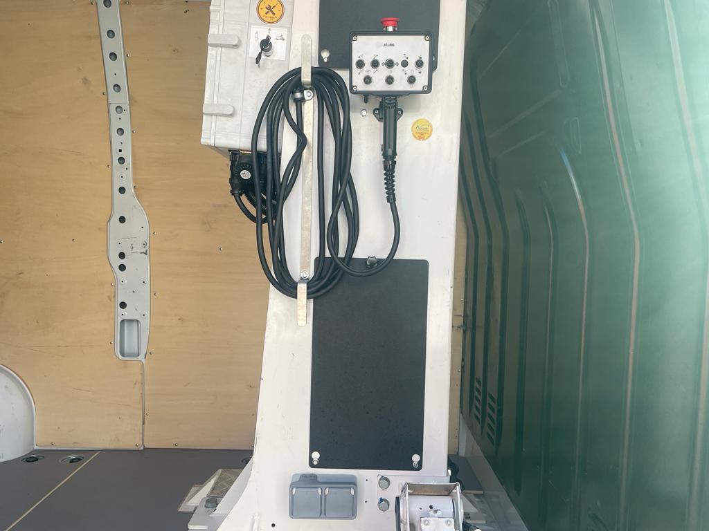 Platforma podnosząca K32 francuskiego producenta KLUBB zamontowana na Renault Master - pompa hydrauliczna ze sprzęgłem magnetycznym napędzana jest pasem klinowym napędzanym przez silnik pojazdu.