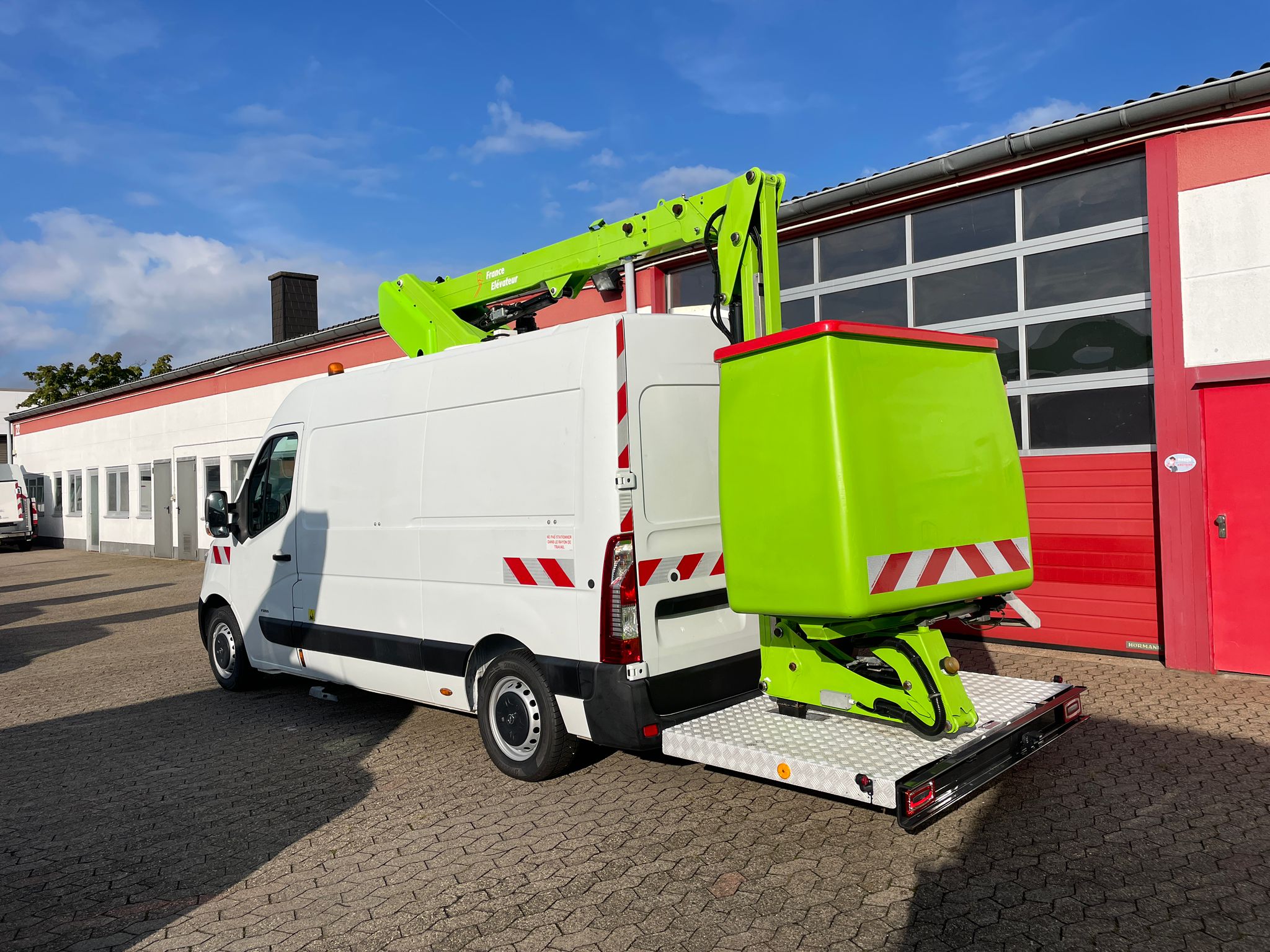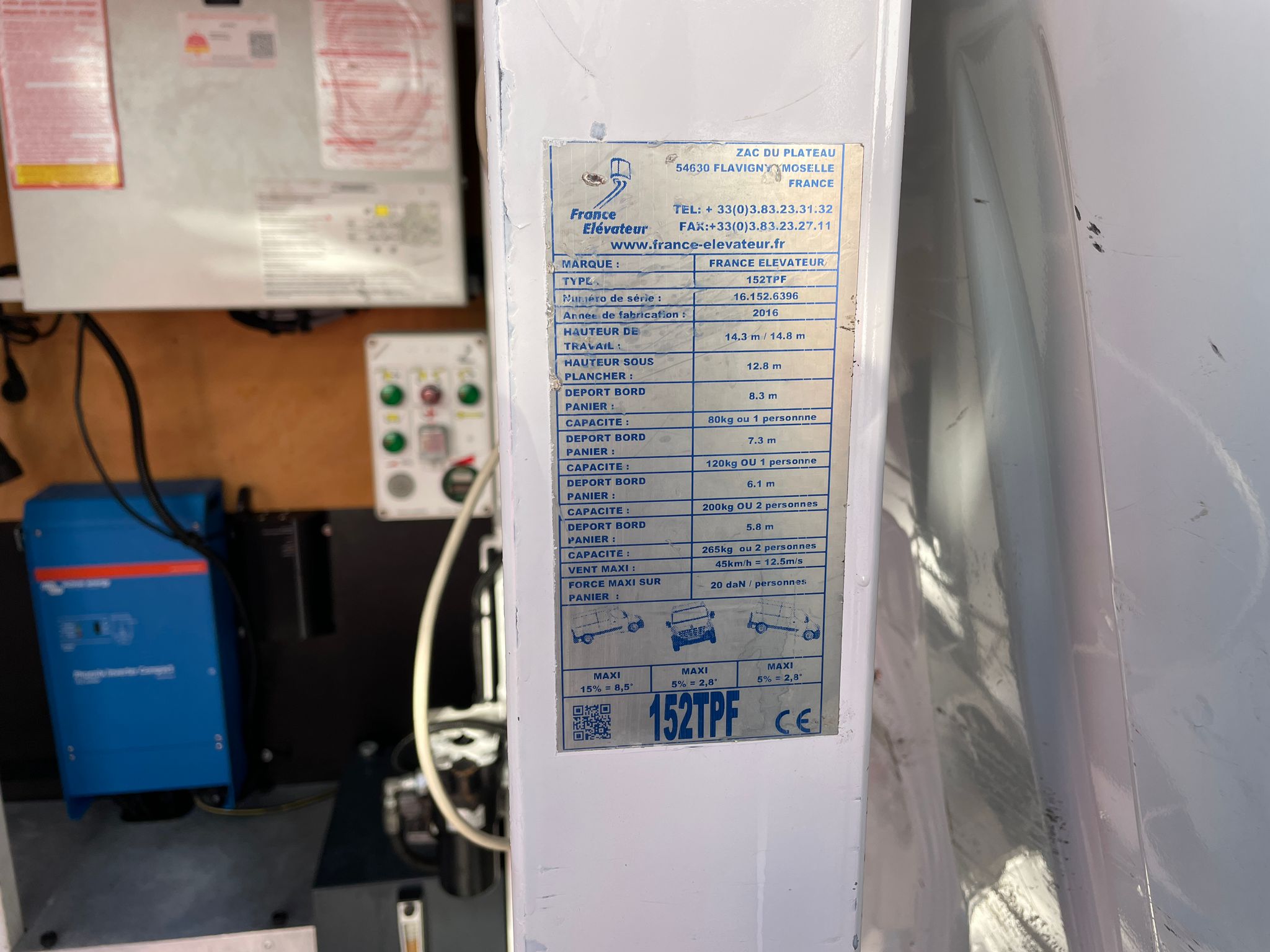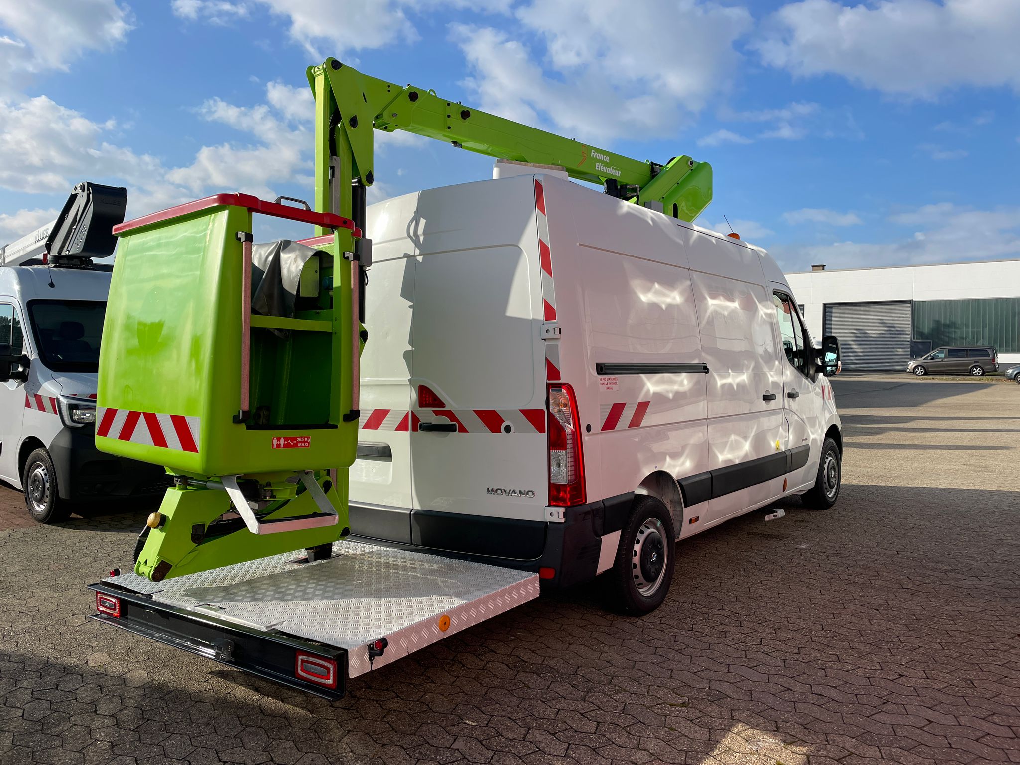 Podnośnik koszowy 152 TPF francuskiego producenta France Elevateur zamontowany na samochodzie Renault Master - pompa hydrauliczna ze sprzęgłem magnetycznym napędzana jest paskiem klinowym napędzanym silnikiem pojazdu. Dzięki ruchomemu wysięgnikowi klatkowemu dostępność, a tym samym praca, jest bardzo elastyczna i ułatwia dostęp do prawie wszystkich obszarów. Optymalny produkt dla firm telekomunikacyjnych i elektrycznych, ale także zakładów użyteczności publicznej i firm malarskich.