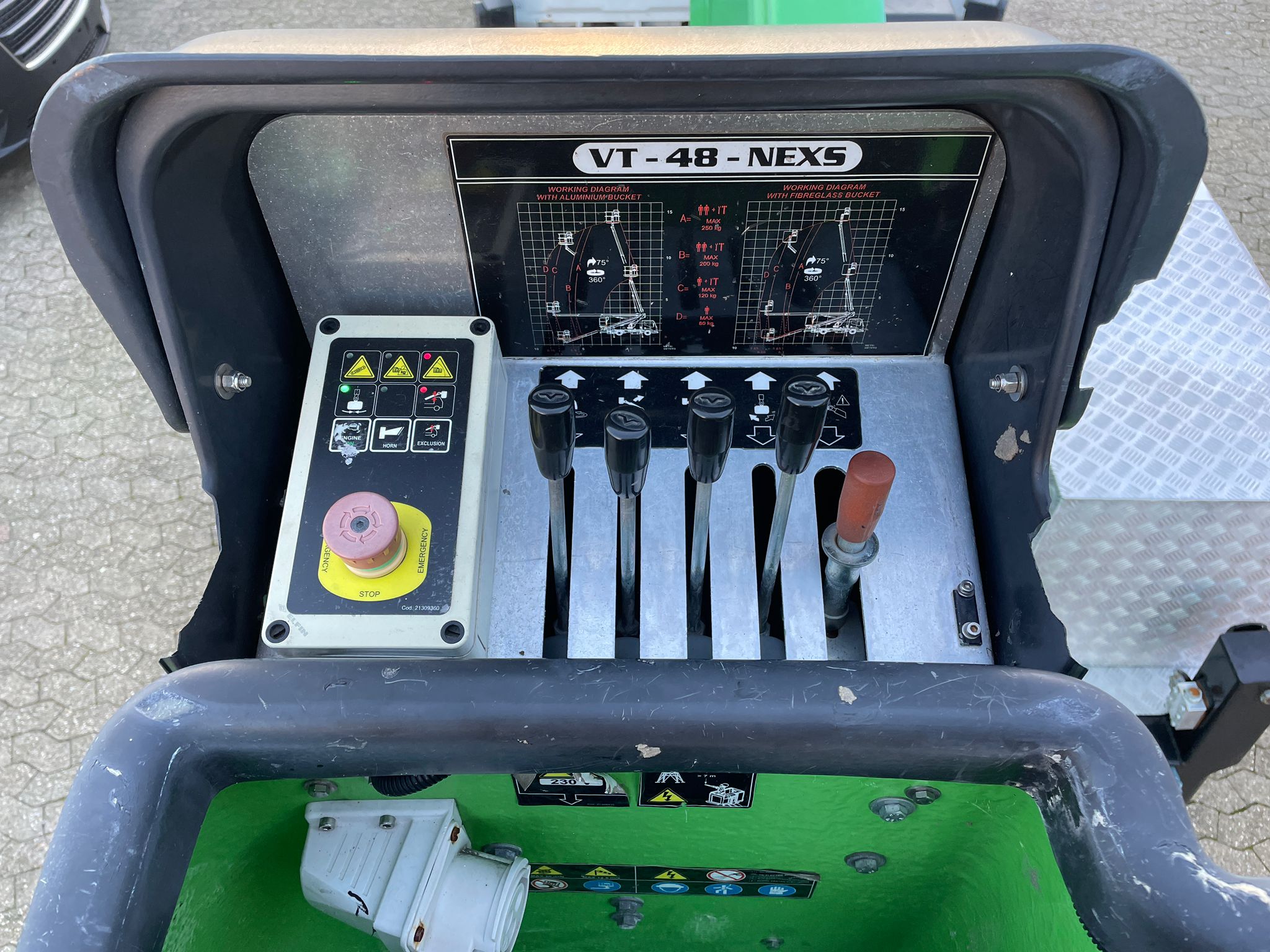 - Jednoręczne proporcjonalne sterowanie joystickiem ruchami hydraulicznymi w koszu roboczym - Podwójne sterowanie na pojeździe za pomocą kabla przedłużającego o długości 5 m.