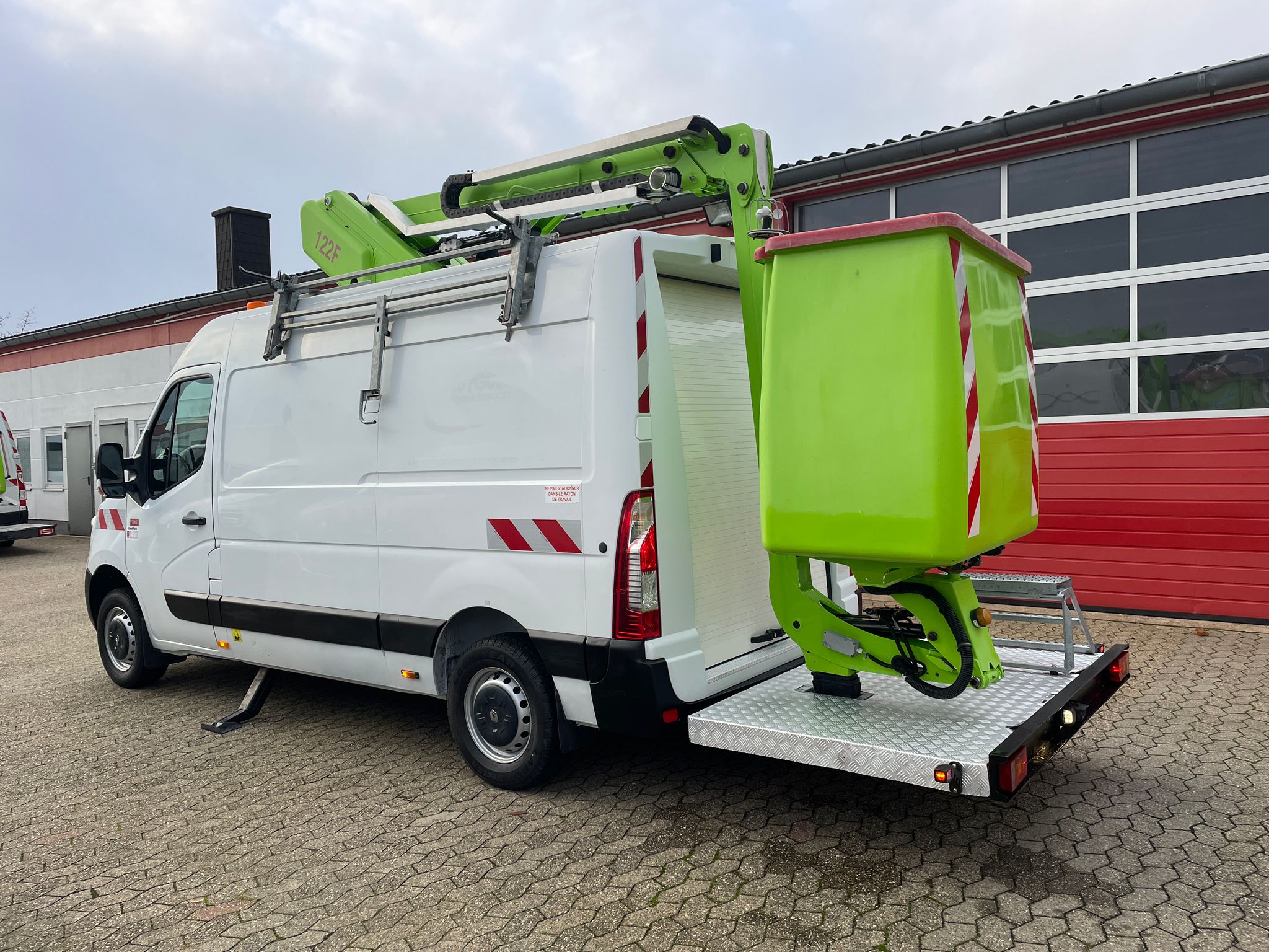 Podnośnik koszowy 122F francuskiego producenta France Elevateur zamontowany na samochodzie Renault Master - pompa hydrauliczna ze sprzęgłem magnetycznym jest napędzana paskiem klinowym napędzanym przez silnik pojazdu. Furgonetka z platformą dostępową 122F jest wyposażona w obracany o 2 x 60° kosz zapewniający idealne dopasowanie do powierzchni roboczej. Dwa stabilizatory zapewniają stabilność i umożliwiają wykonywanie wszystkich rodzajów prac, nawet na stromych zboczach o nachyleniu do 15%. Kosz o udźwigu 200 kg i zasięgu 7,00 m uzupełniają tę wyjątkową wydajność.