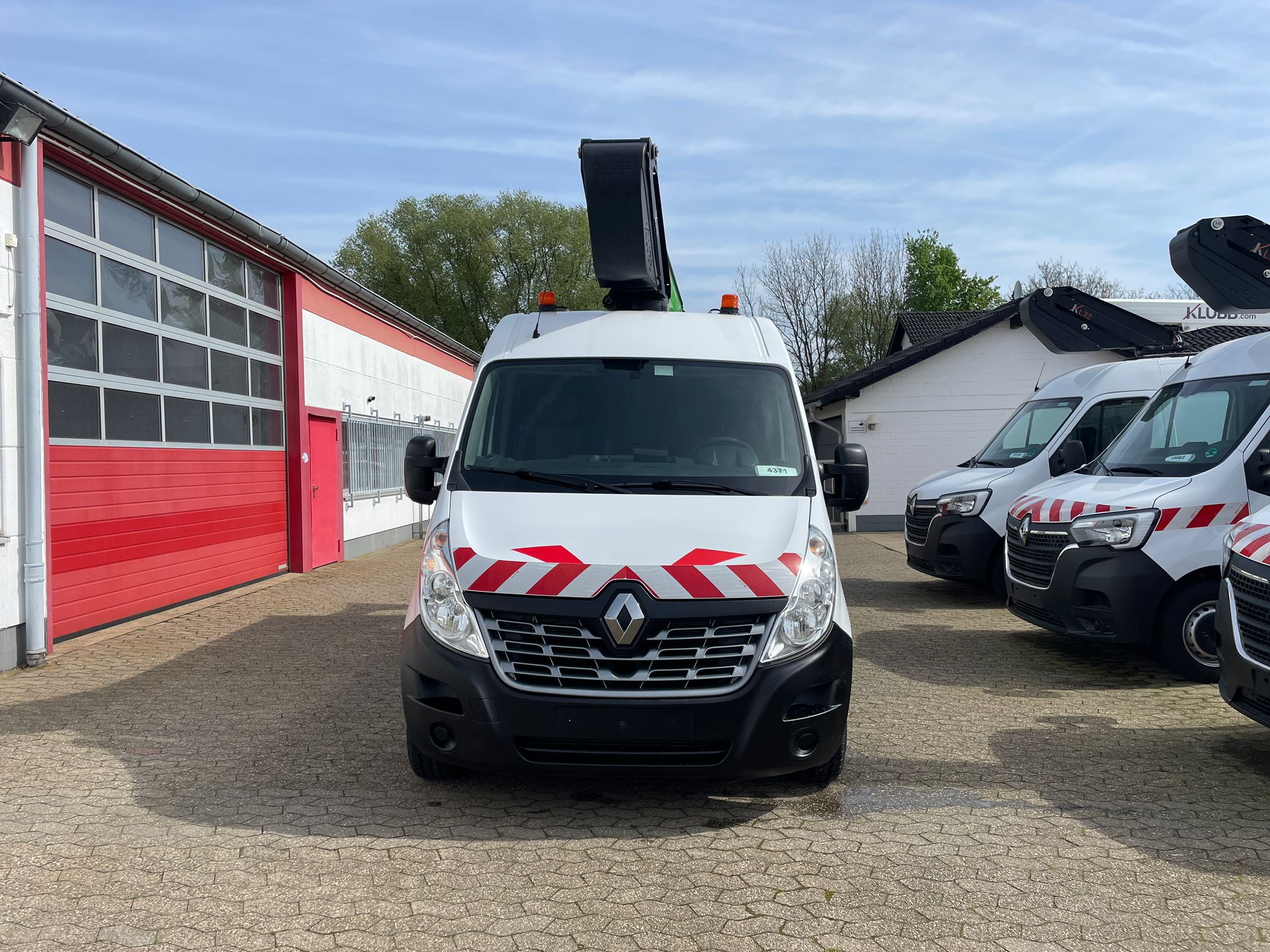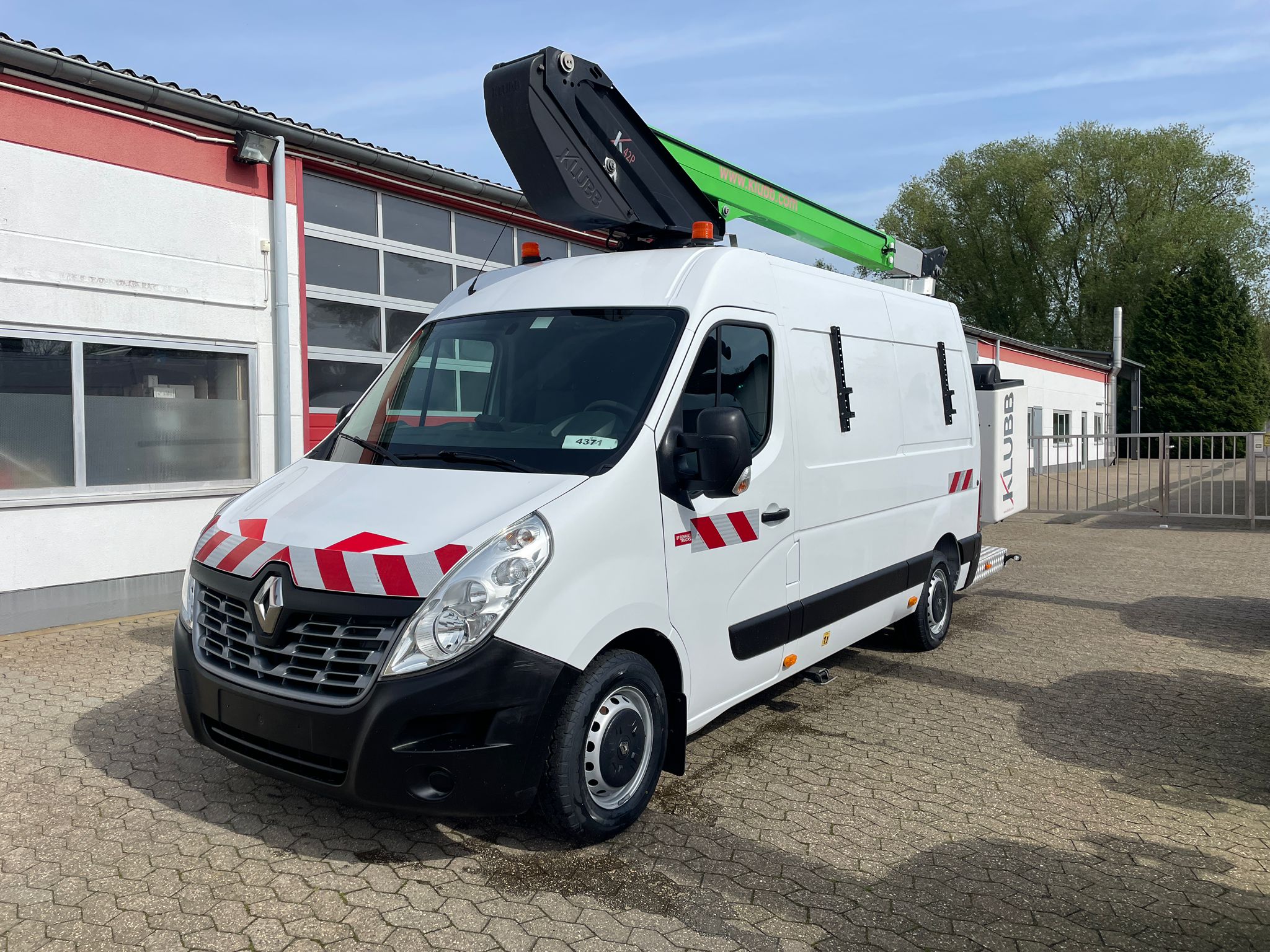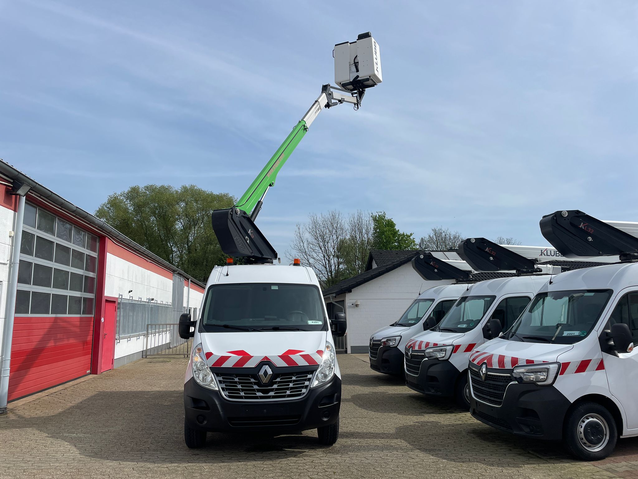 Podnośnik koszowy K42P francuskiego producenta KLUBB zamontowany na samochodzie Renault Master - pompa hydrauliczna ze sprzęgłem magnetycznym napędzana jest paskiem klinowym napędzanym silnikiem pojazdu.
