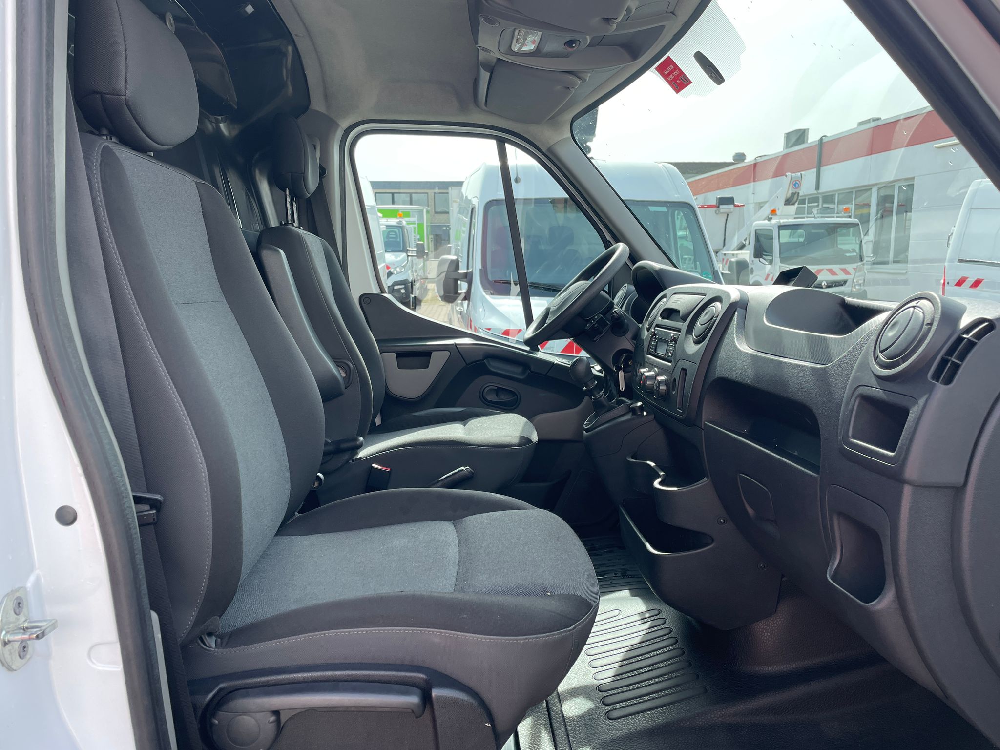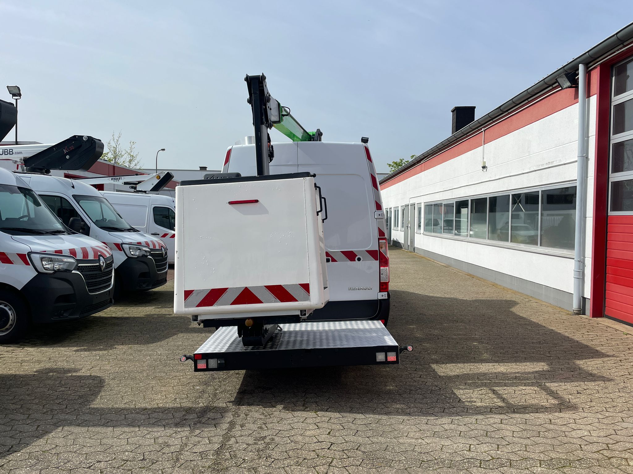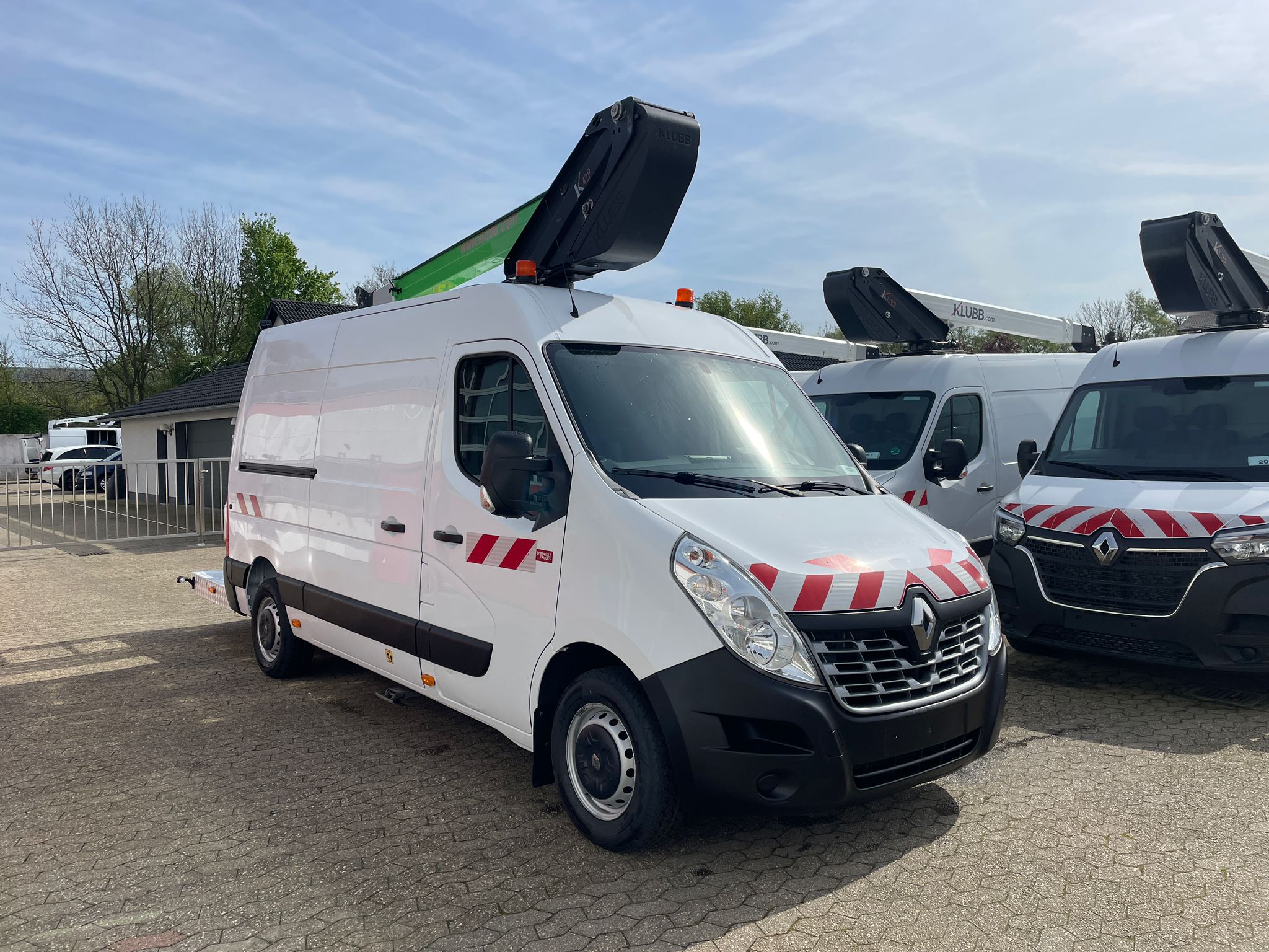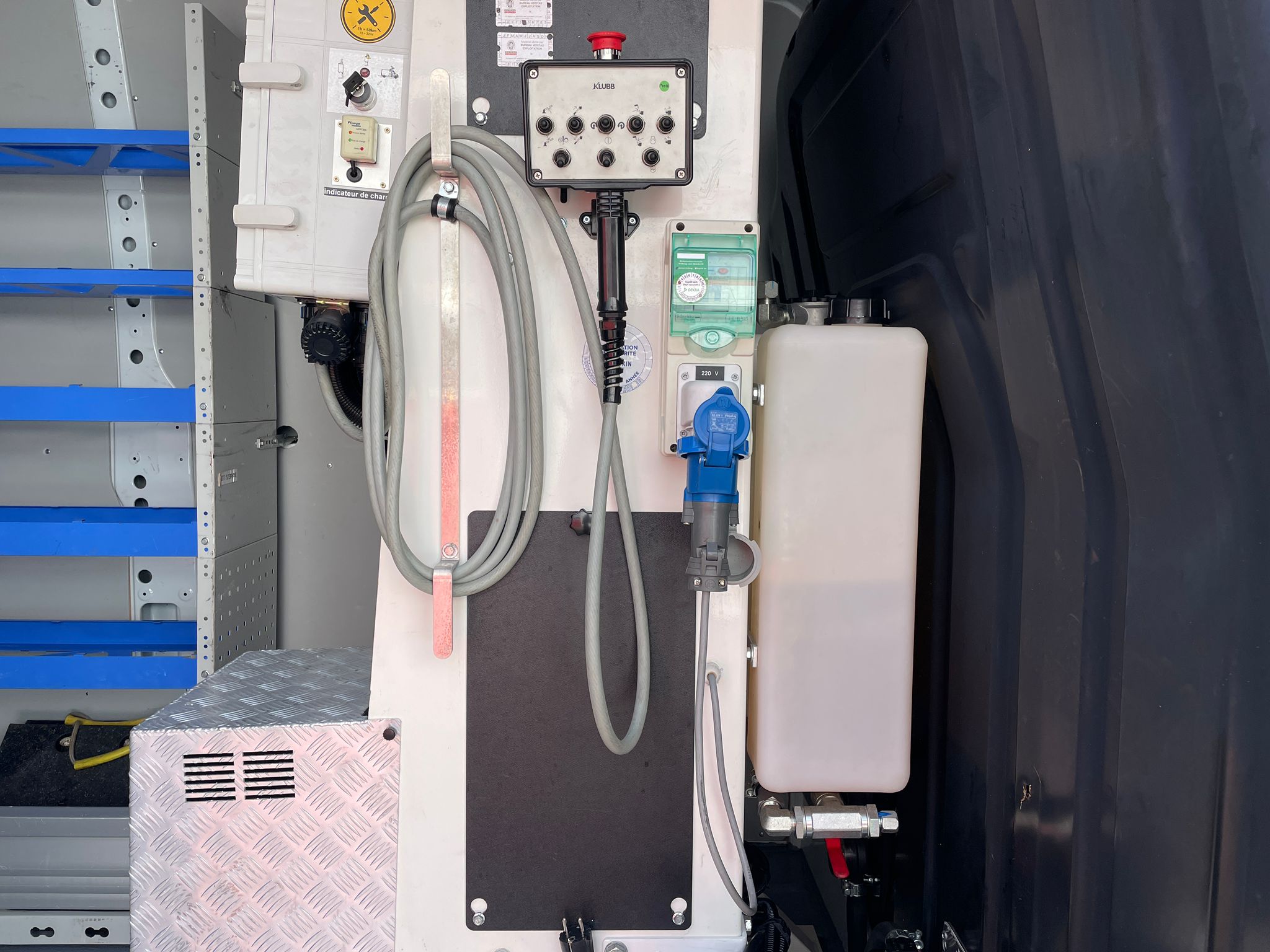Podnośnik koszowy K42P francuskiego producenta KLUBB zamontowany na samochodzie Renault Master - pompa hydrauliczna ze sprzęgłem magnetycznym napędzana jest paskiem klinowym napędzanym silnikiem pojazdu.