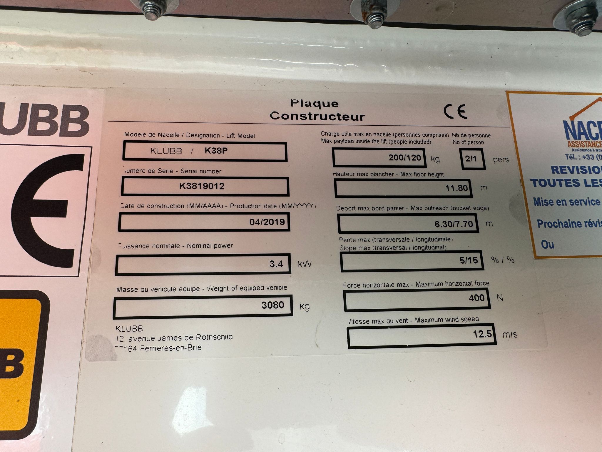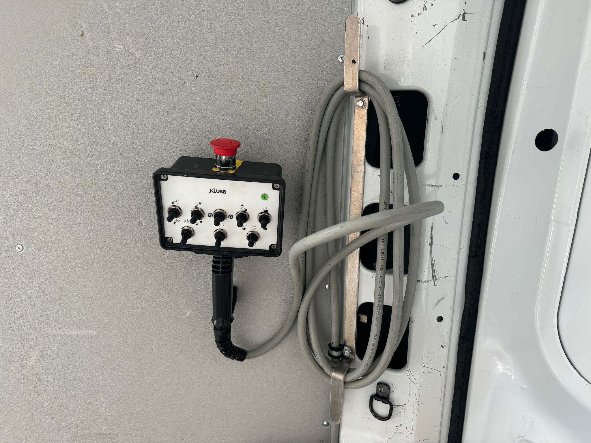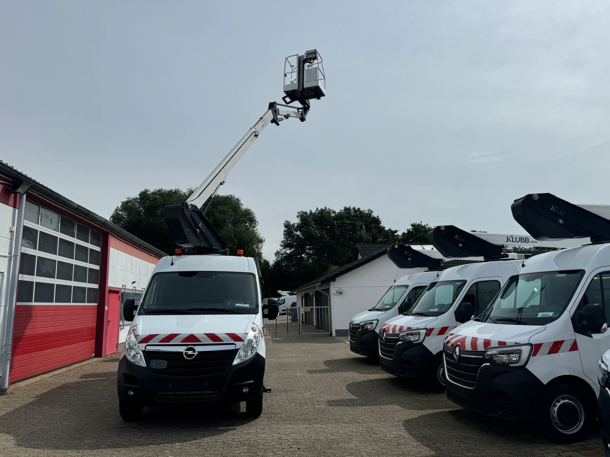 Podnośnik koszowy K38P francuskiego producenta KLUBB zamontowany na samochodzie Opel Movano - pompa hydrauliczna ze sprzęgłem magnetycznym jest napędzana paskiem klinowym napędzanym przez silnik pojazdu.