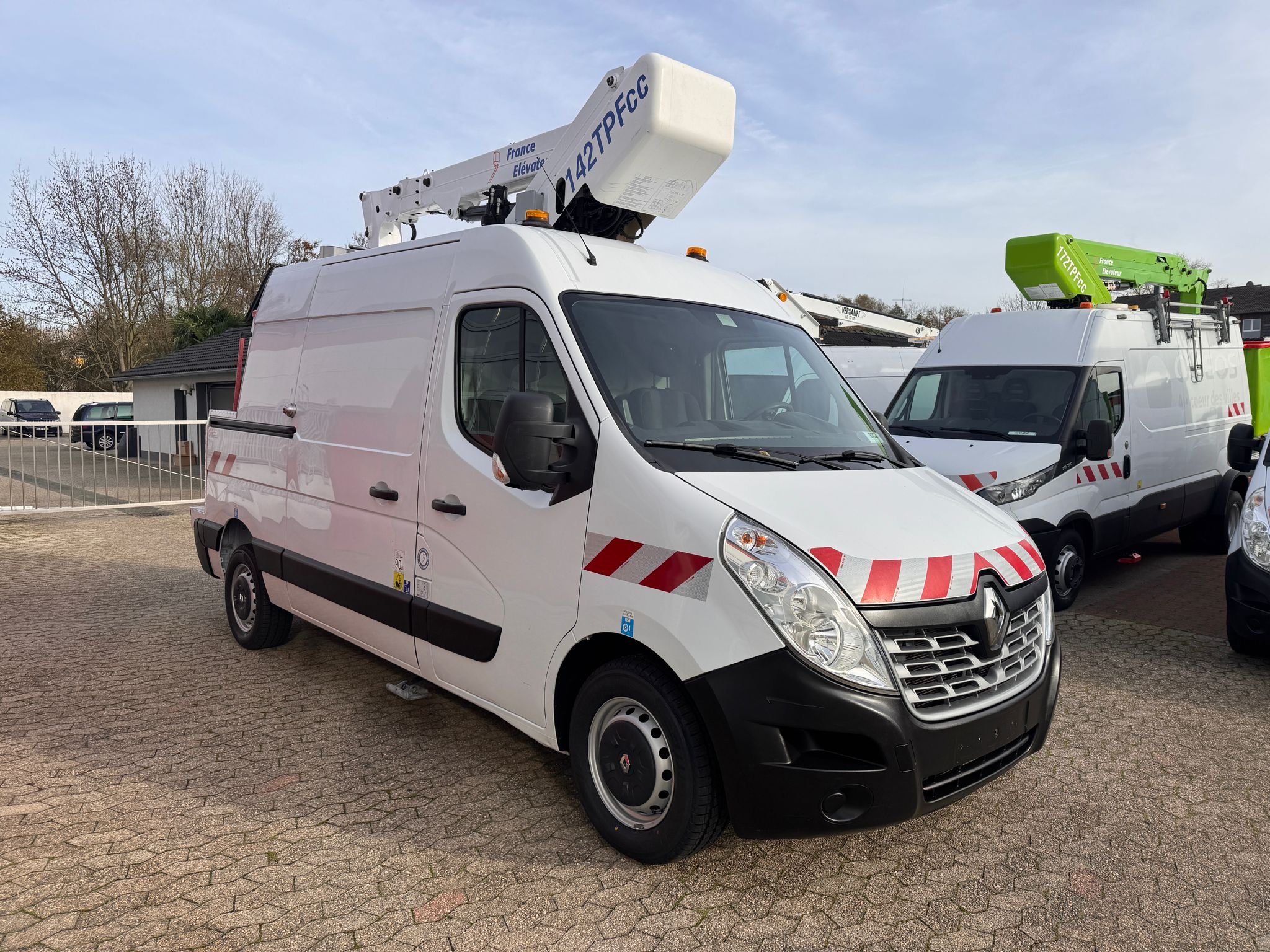 Renault Master jest wyposażony w profesjonalny podnośnik koszowy France Elevateur, model 142 TPFcc. Platforma umożliwia imponującą wysokość roboczą i bezpieczny oraz efektywny dostęp do miejsc pracy wymagających konserwacji lub napraw.
